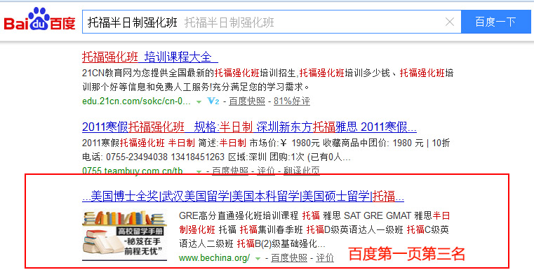 關(guān)鍵詞“托福半日制強(qiáng)化班”在百度排名:第1頁(yè)第3名
